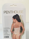 The Penthouse Eye of the Storm Bodystocking is a lace suspender one-piece bodystocking in white.