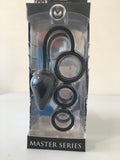 Pleasure is yours with this devious silicone tri cock ring and anal plug from the Master Series. Made of premium silicone so it is long lasting, non-porous, and body safe, this flexible piece is ideal for anyone interested in dual stimulation and erection enhancement. By simply arranging the testicles and shaft of your plaything within the confines of the darkly sexy triple cock rings, then inserting the tapered anal plug, your plaything will enjoy the full feeling while his member is standing at attention.